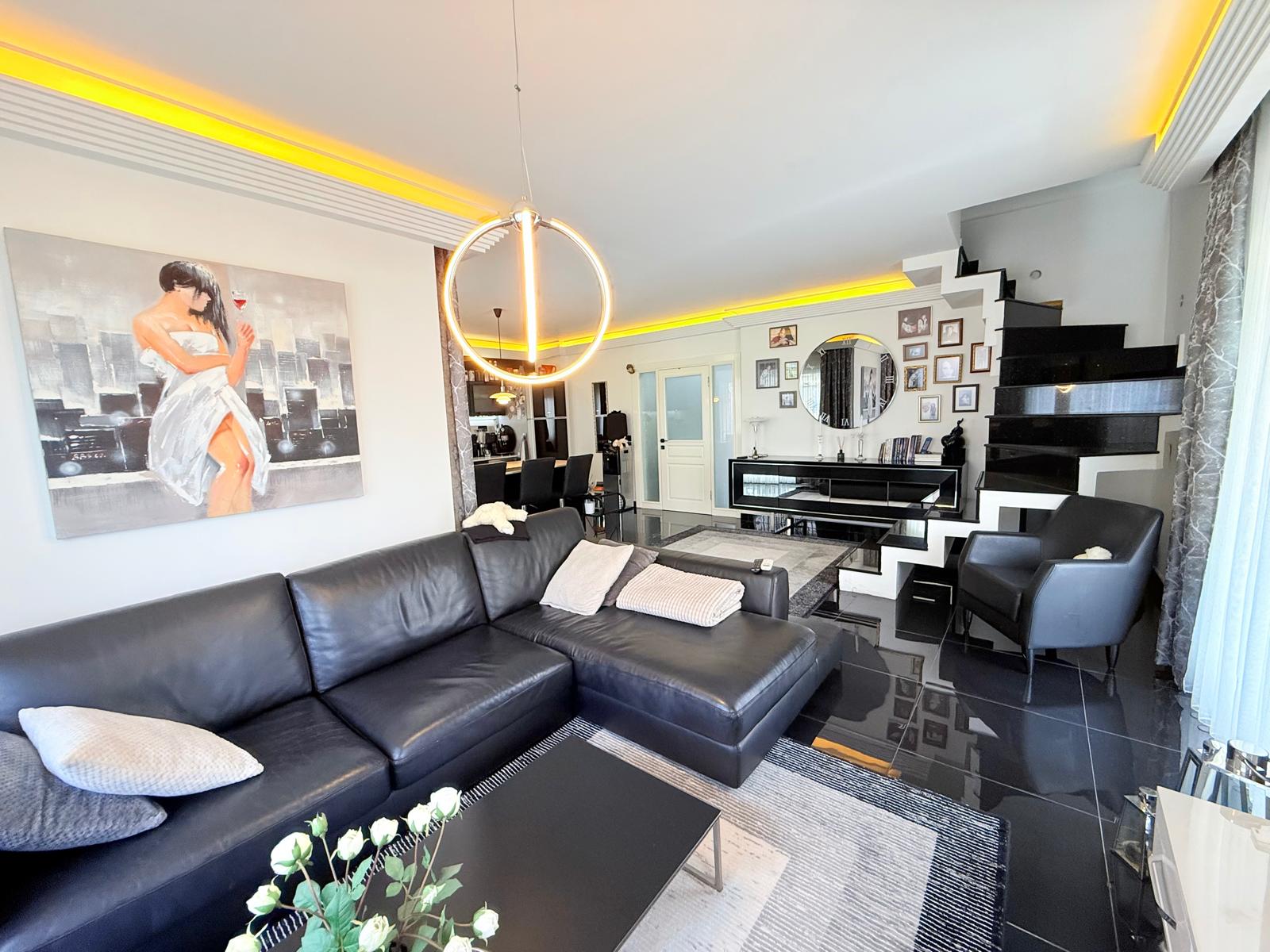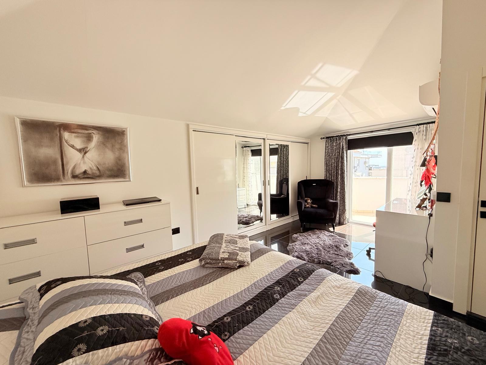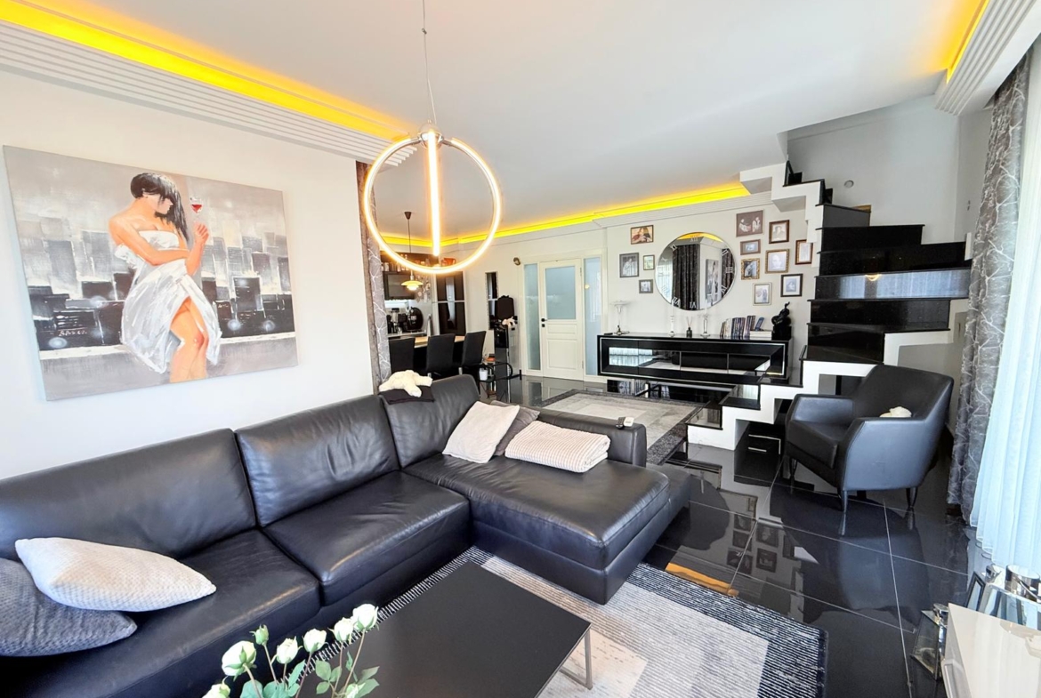 Dwupoziomowy apartament na sprzedaż w bardzo dobrej lokalizacji, w samym centrum Alanyi. W odległości 100 m znajduje się plaża Kleopatry, centrum handlowe, restauracje i regionalny bazar. Mieszkanie znajduje się na ostatnim piętrze․ Zwrócone jest w kierunku wschodnio-południowo-zachodnim․ Posiada trzy sypialnie‚ dwa salony oraz kuchnie․ Apartament ma trzy łazienki oraz siedem balkonów․ Jest w pełni umeblowane․ Apartament posiada system kamer w mieszkaniu․